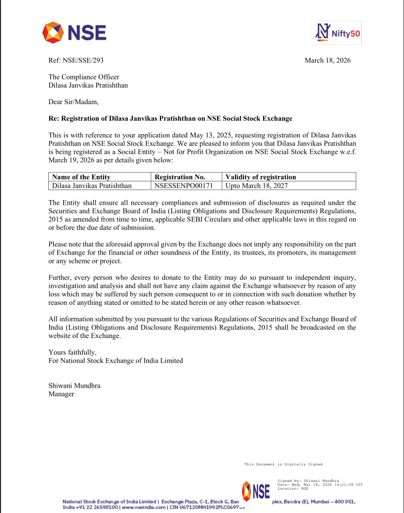 Dilasa Janvikas Pratishthan is a Civil Society organization, engaged in implementing sustainable rural development programs by focusing on natural resource management, climate resilient agriculture, model village development includes health/education initiatives, livelihood enhancement and women empowerment. It has treated over 7.82 lakh ha of land under different watershed programs apart from working in water supply, irrigation and aquifer management. Dilasa has created a strong foundation in water management as means to sustainable natural resource management. It has a strong connect with rural community specially the farmers through its various projects therefore, well understands their needs and requirements. The organization is equipped with a highly technical and experienced team which is enabling it to achieve its goal. The organization is aligning its projects with United Nations Sustainable Development Goals (SDG's).